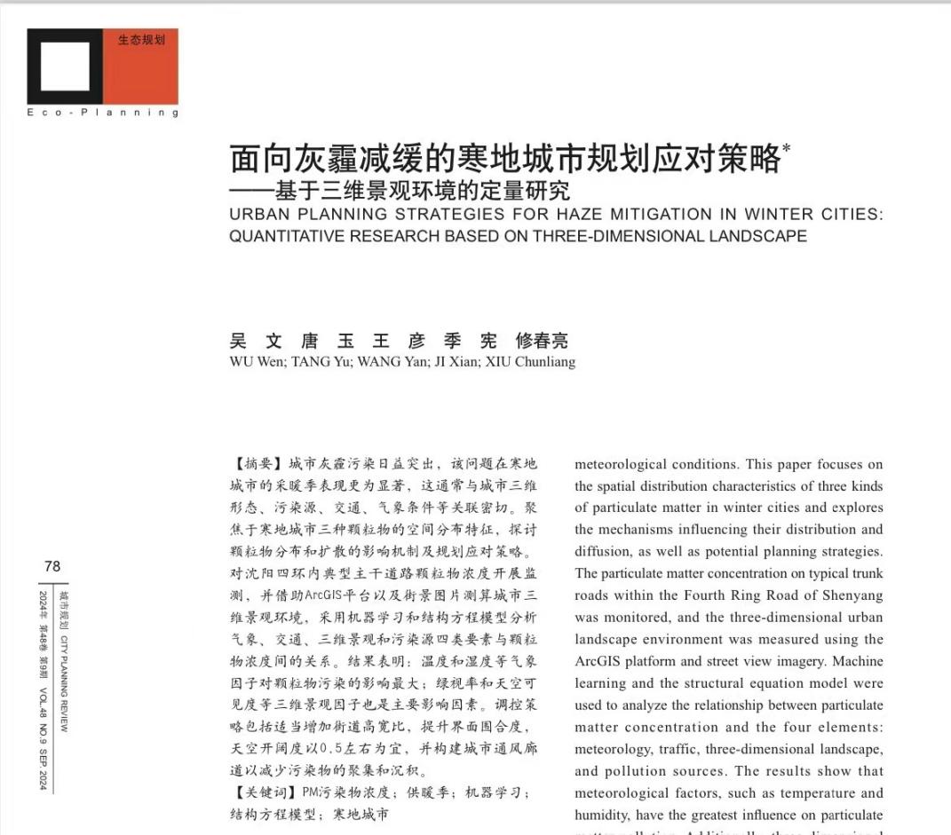 近日,betway中文 城乡规划系吴文副教授团队在CSSCI期刊《城市规划》上发表题为“面向灰霾减缓的寒地城市规划应对策略——基于三维景观环境的定量研究”的论文。该研究成果以betway中文-betway中国 为第一完成单位,吴文副教授为第一作者,修春亮教授为通讯作者,该成果的合作作者还有硕士研究生唐玉、博士研究生王彦以及讲师季宪。